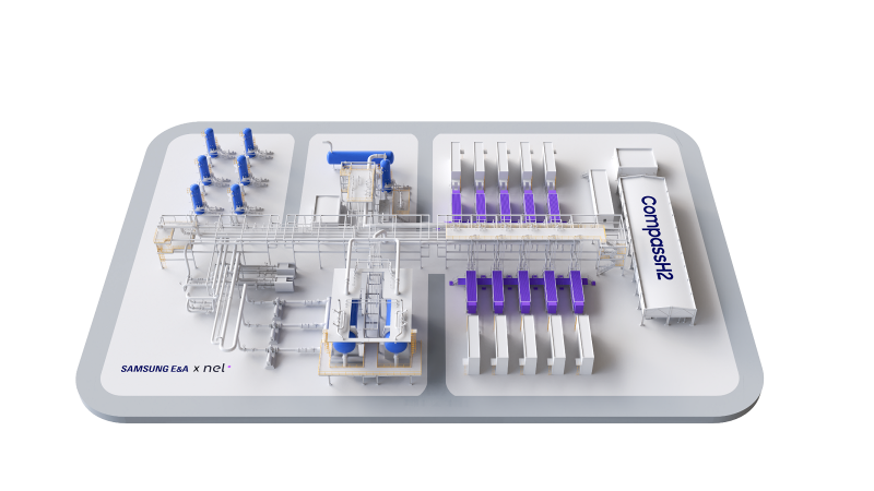 'Compass H2' is a green hydrogen production solution developed by SAMSUNG E&A in collaboration with the global electrolysis company Nel Hydrogen, providing all stages of plant construction, from pre-feasibility studies to EPC (Engineering, Procurement, and Construction) and performance guarantee.